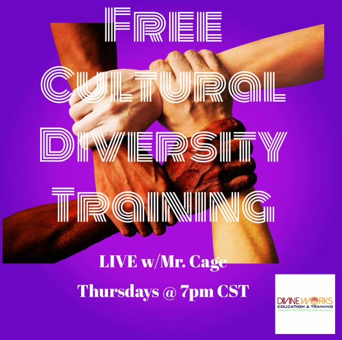 We’re doing FREE cultural diversity training the first Thursday of every month via Zoom at 7pm CST.