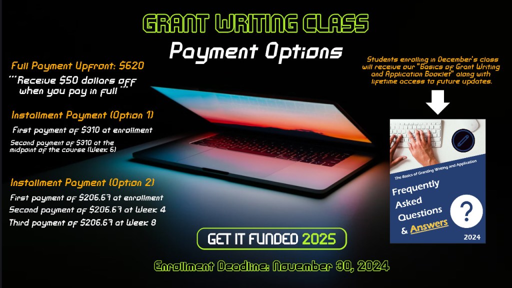 Our upcoming grant writing class, titled “Get It Funded,” will take place from December 2, 2024, to March 3, 2025, every Monday from 7-9 PM CST.